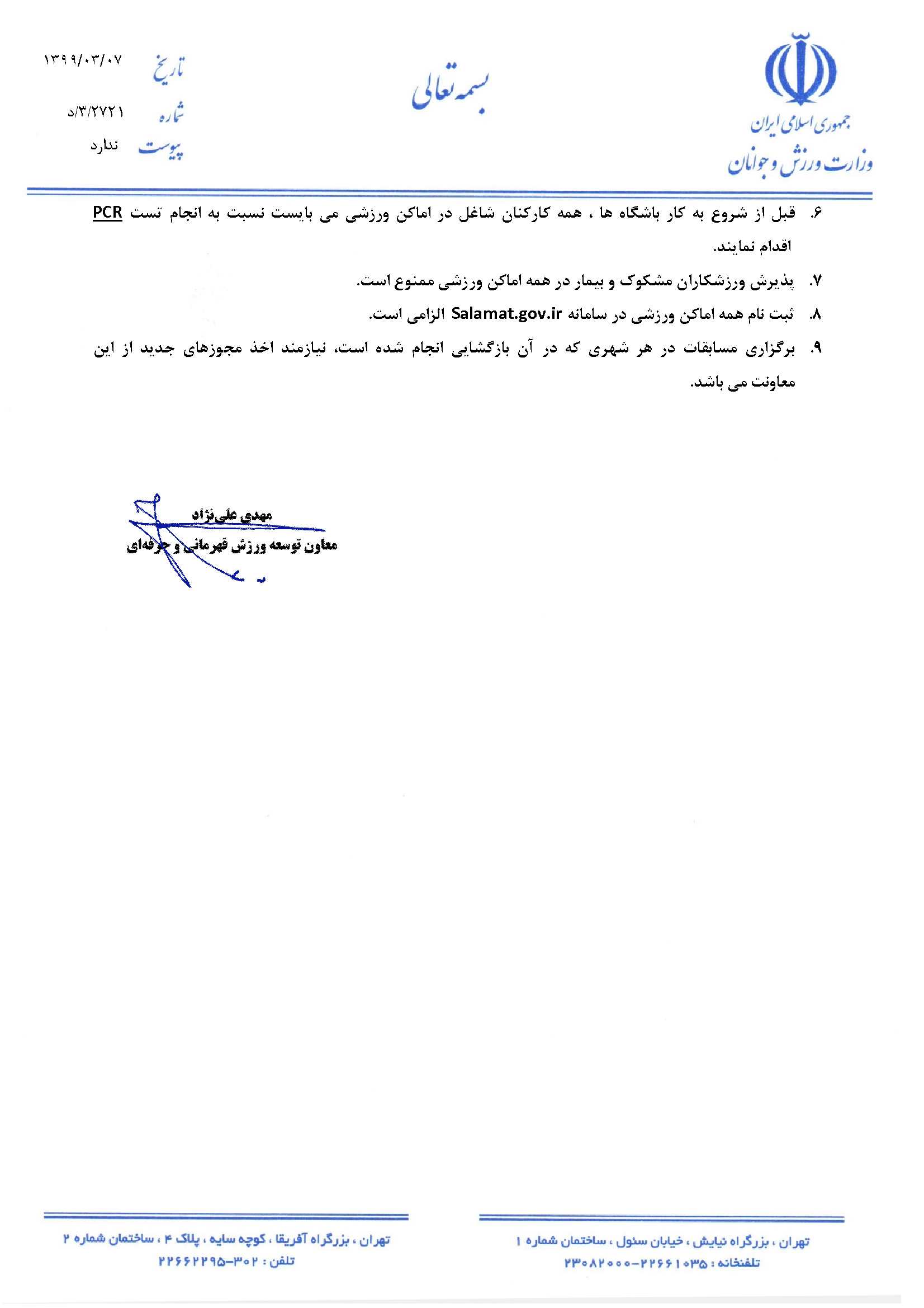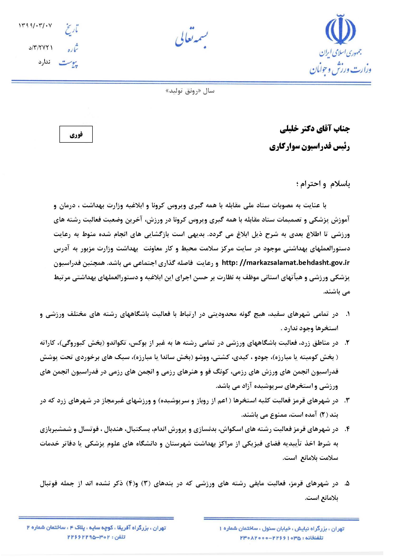 بخشنامه بازگشایی و فعالیت باشگاه های ورزشی
