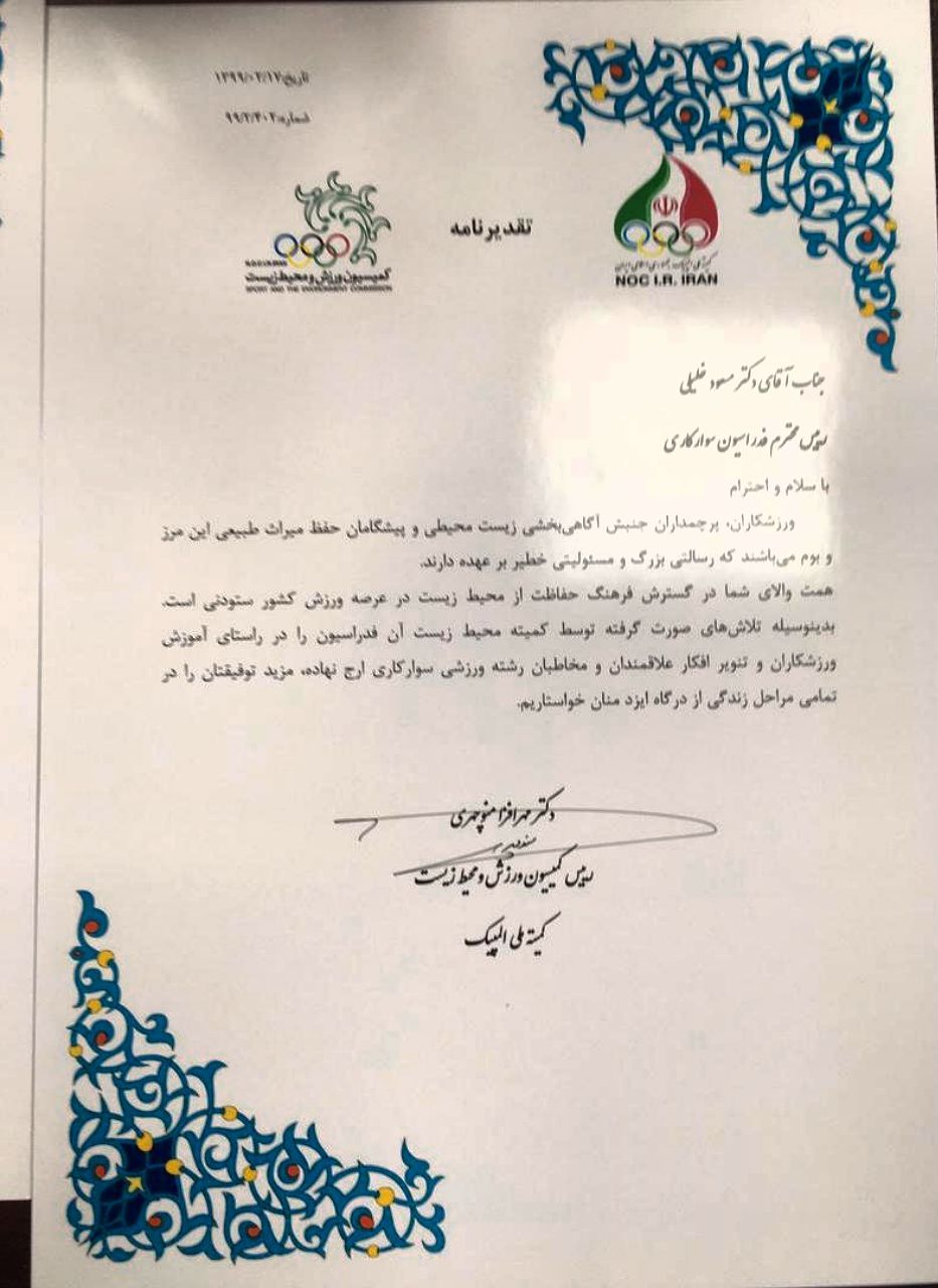 تقدير رييس كميسيون ورزش و محيط زيست كميته ملي المپيك از دكتر مسعود خليلي و رييس كميته محيط زيست فدراسيون سواركاري